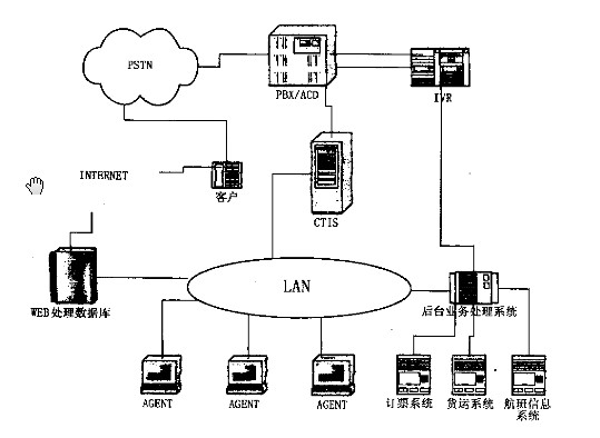 目前通過電話方式訪問客戶服務(wù)中心的旅客數(shù)量遠(yuǎn)遠(yuǎn)大于通過其他方式的訪問旅客數(shù),特別是在國內(nèi),因此首先考慮電話方式的接入,在此基礎(chǔ)上逐步考慮接入到機(jī)場信息網(wǎng)絡(luò),實(shí)現(xiàn)呼叫中心與機(jī)場客票銷售、貨物運(yùn)輸?shù)臒o縫連接。